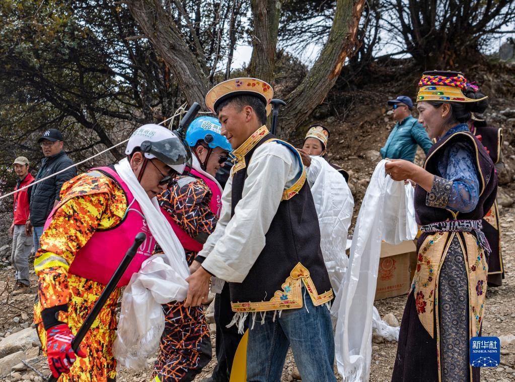 4月16日,激流漂流筏繞標賽后,當?shù)厝罕娊o完賽運動員獻上哈達。新華社記者 孫非 攝