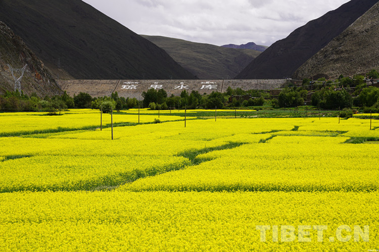 圖為瓊結縣瓊果水庫下游農田開滿油菜花 攝影:曲杰