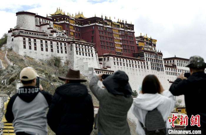 5月19日,游客在西藏拉薩布達拉宮觀景臺拍照留念。5月的拉薩初夏,草木漸茂、綠樹成蔭,雨量充沛、濕度適宜,日光充盈卻少了一絲燥熱,成為了眾多游客選擇進藏的最佳時節(jié)。 中新社記者 李林 攝