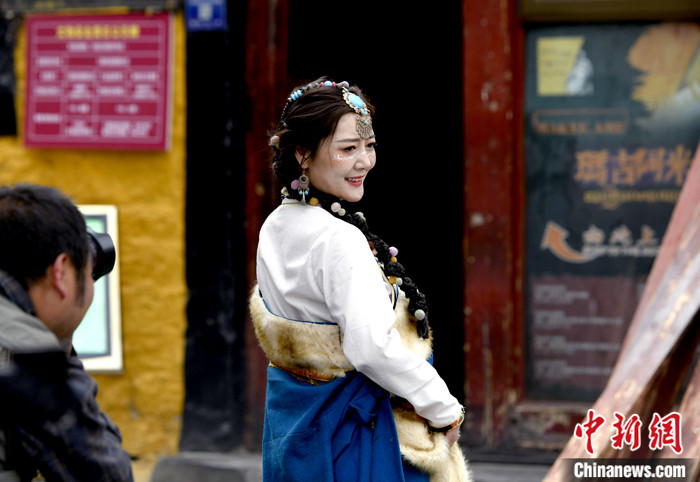 5月19日,游客身著民族特色的服裝在拉薩八廓街拍照留念。5月的拉薩初夏,草木漸茂、綠樹成蔭,雨量充沛、濕度適宜,日光充盈卻少了一絲燥熱,成為了眾多游客選擇進藏的最佳時節(jié)。 中新社記者 李林 攝