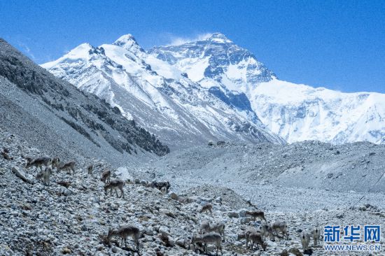 5月9日,棲息在珠穆朗瑪峰登山大本營(yíng)附近的巖羊。新華網(wǎng) 旦增努布 攝