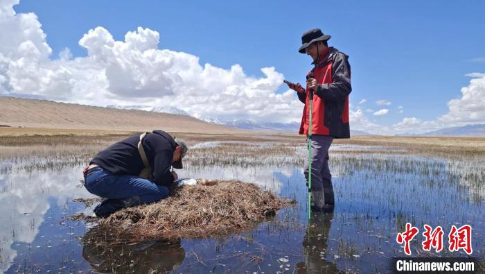 圖為楊巨才(右)在甘肅酒泉市肅北縣黨河濕地開展黑頸鶴巢位監(jiān)測(cè)工作。(資料圖) 受訪者供圖