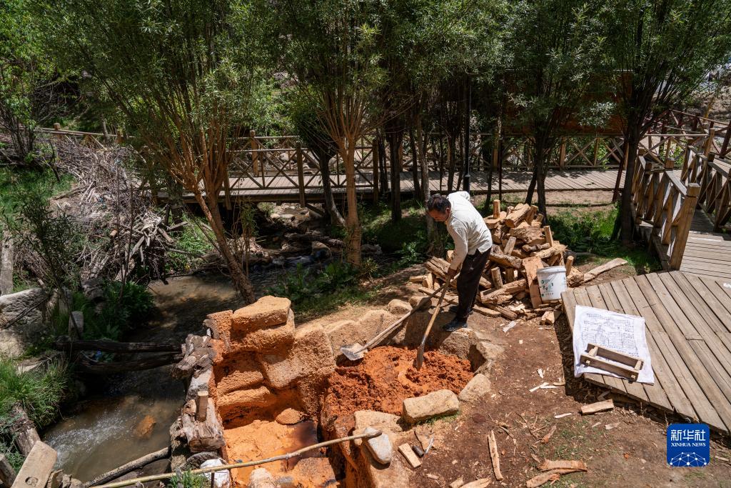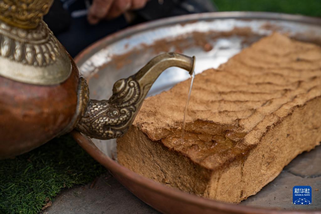 在西藏尼木縣吞巴鎮(zhèn)吞達(dá)村,次仁多吉用水浸潤晾曬后的香磚(6月9日攝)。新華社記者 孫非 攝