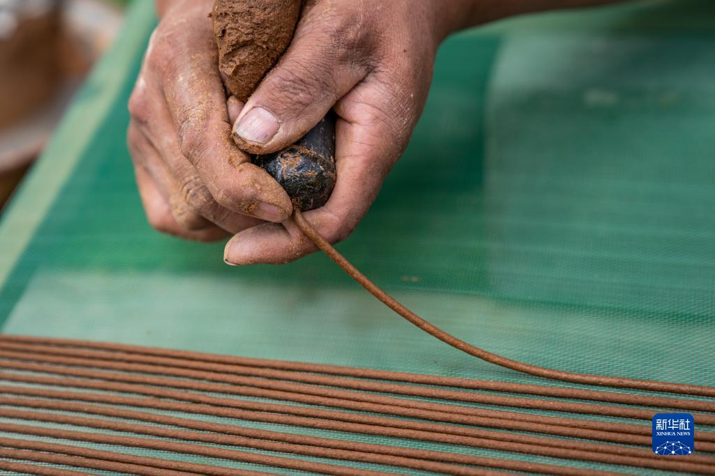 在西藏尼木縣吞巴鎮(zhèn)吞達(dá)村,次仁多吉將柏木漿制作成香磚(6月9日攝)。新華社記者 孫非 攝