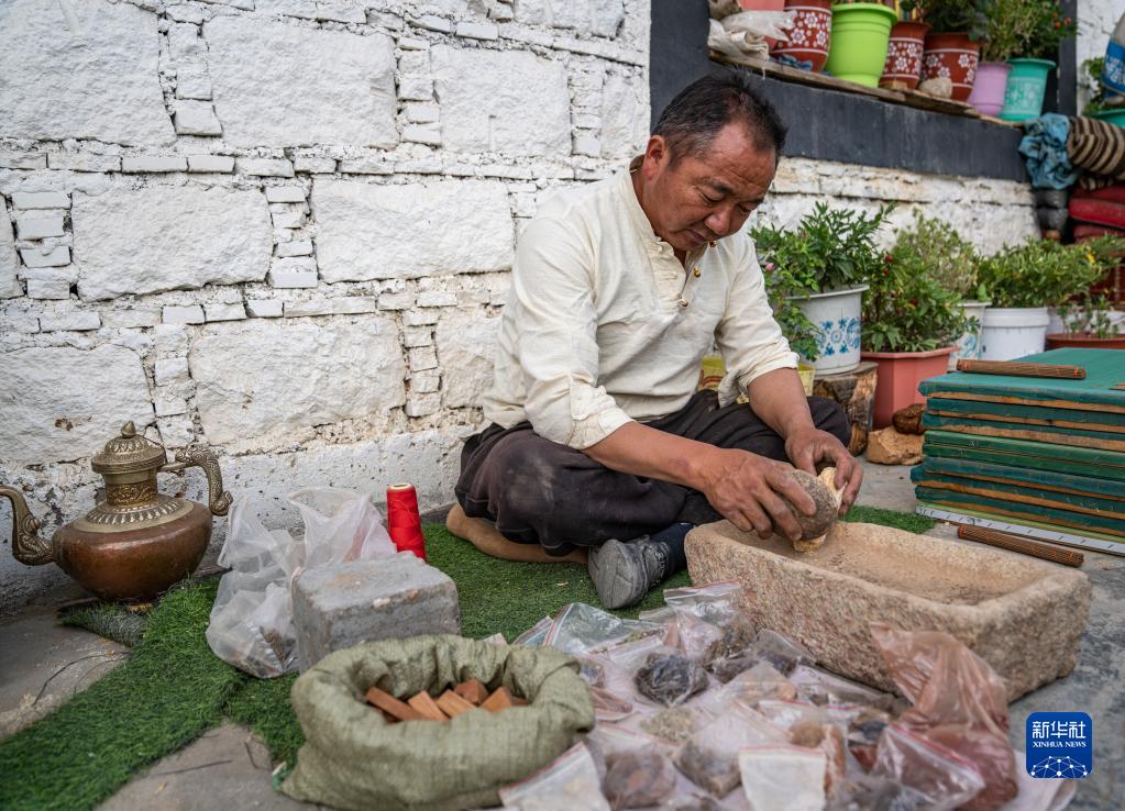 在西藏尼木縣吞巴鎮(zhèn)吞達(dá)村,次仁多吉在研磨藥材和香料(6月9日攝)。新華社記者 孫非 攝