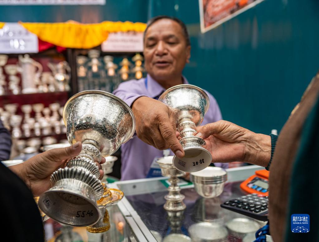 在第五屆藏博會(huì)現(xiàn)場(chǎng),來(lái)自尼泊爾的參展商向顧客介紹自己的產(chǎn)品(6月18日攝)。新華社記者 孫非 攝