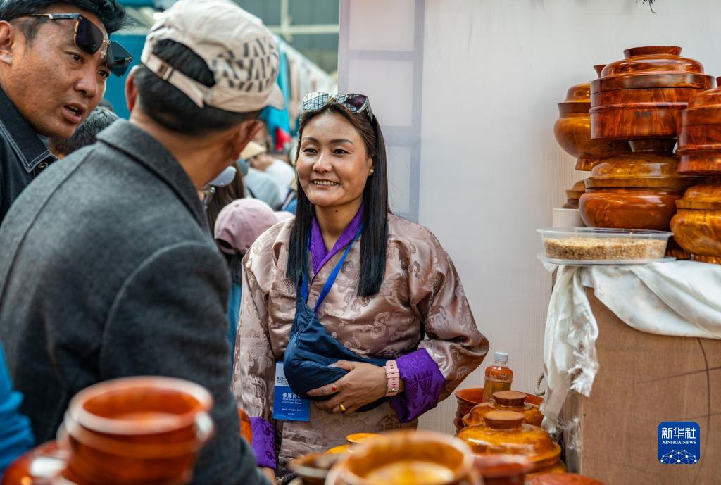 在第五屆藏博會(huì)現(xiàn)場(chǎng),來(lái)自不丹的參展商旺姆·德基(右一)跟顧客交談(6月17日攝)。新華社記者 孫非 攝
