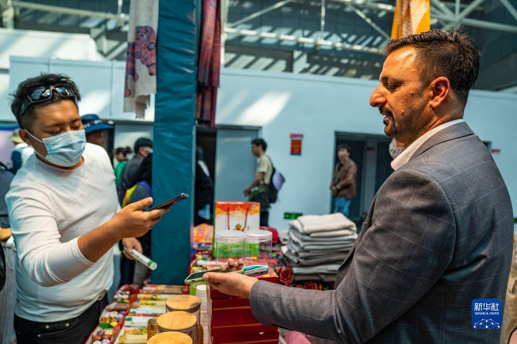 在第五屆藏博會(huì)現(xiàn)場(chǎng),來(lái)自印度的參展商伊納亞特·艾哈邁德·汗(右)使用二維碼收款(6月17日攝)。新華社記者 孫非 攝