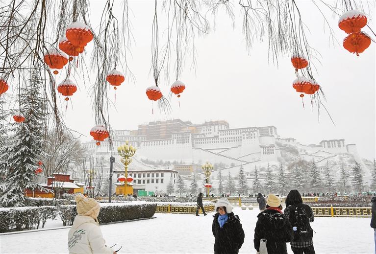 1月18日是農(nóng)歷臘八節(jié),拉薩也迎來了新年之后的第二場大雪,古城處處銀裝素裹,布達(dá)拉宮在白雪映襯下,顯得格外圣潔莊嚴(yán)。