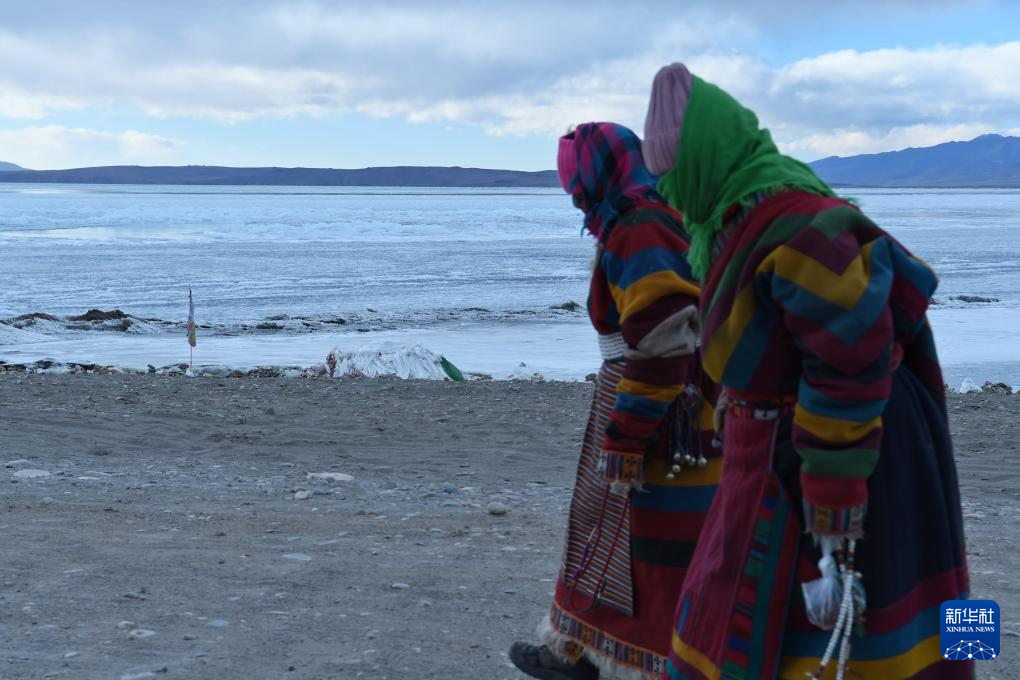 兩位老人從瑪旁雍錯(cuò)岸邊走過(guò)(1月29日攝)。新華社記者 劉文博 攝