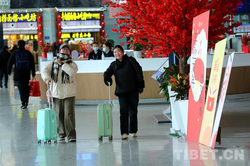 資料圖:拉薩貢嘎機場內(nèi)節(jié)日氛圍濃厚 游客愉快出行