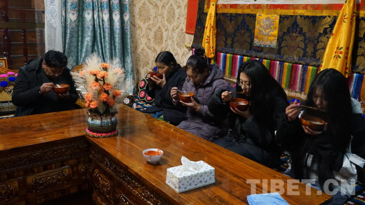 下午時分,“古突”夜的準備就開始了,先是將羊肉放入鍋中燉煮,再是將白蘿卜切片備好,隨后與奶奶、兩個女兒及丈夫,一家人圍坐在溫暖的廚房說說笑笑地捏“古突”里的面疙瘩,做面疙瘩時,要準備一些稍大的特殊面疙瘩,分別包進寫有石子、辣椒、羊毛、木炭等字樣的紙條,代表“心腸硬”“刀子嘴”“心腸軟”“黑心腸”等含義,待到吃“古突”環(huán)節(jié),來一場藏式風(fēng)格的“開盲盒”,據(jù)說每個人吃到的字樣能在某種程度上代表新一年的運勢或性格。