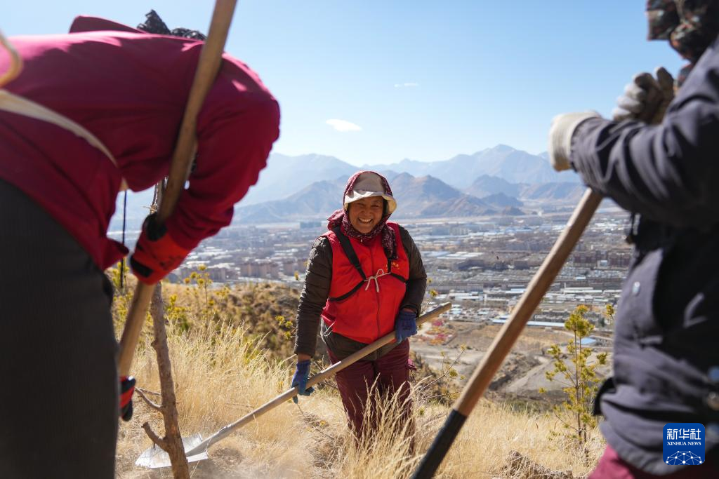 3月12日,仁增(中)和東嘎社區(qū)二組村民在植樹。新華社記者 丁增尼達(dá) 攝 ??