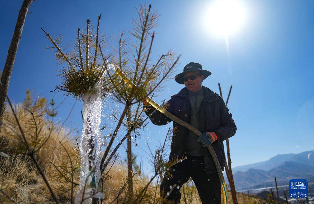 3月12日,東嘎社區(qū)二組村民在給樹苗澆水。新華社記者 晉美多吉 攝 ??