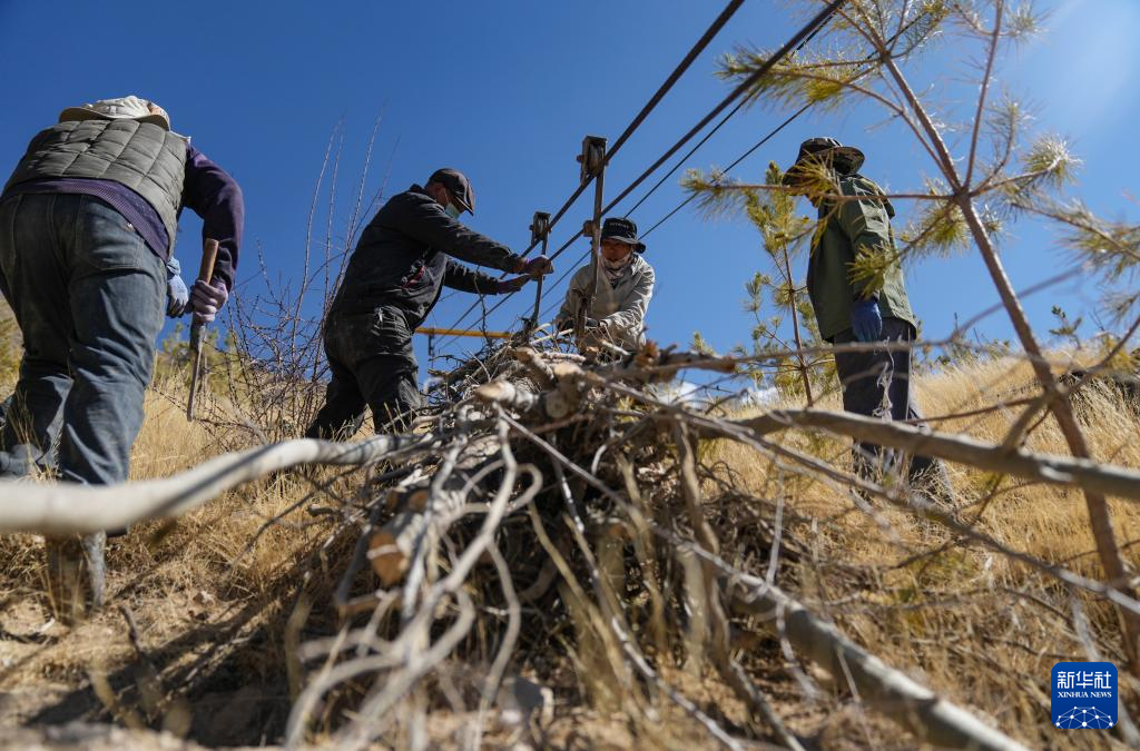 3月12日,東嘎社區(qū)二組村民在通過索道運(yùn)輸樹苗。新華社記者 晉美多吉 攝 ??
