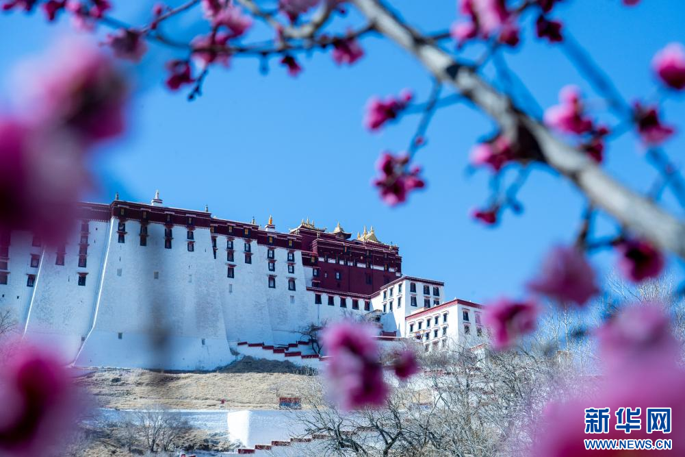 3月15日,杏花映襯下的布達拉宮。新華網(wǎng) 旦增努布 攝