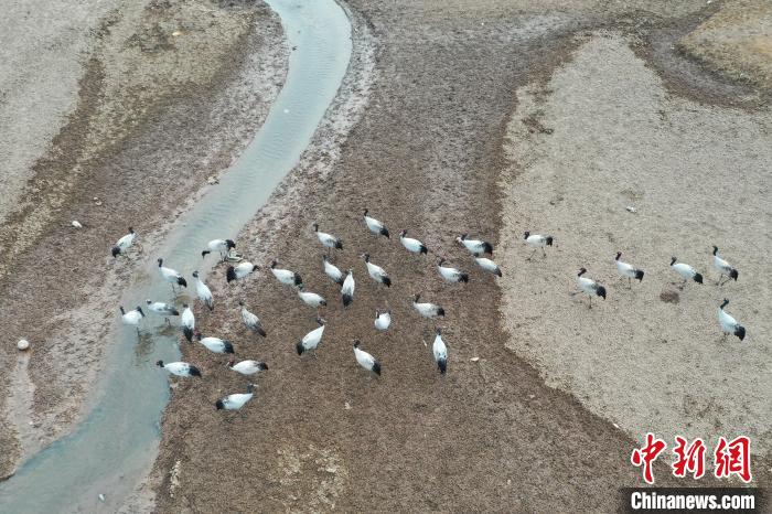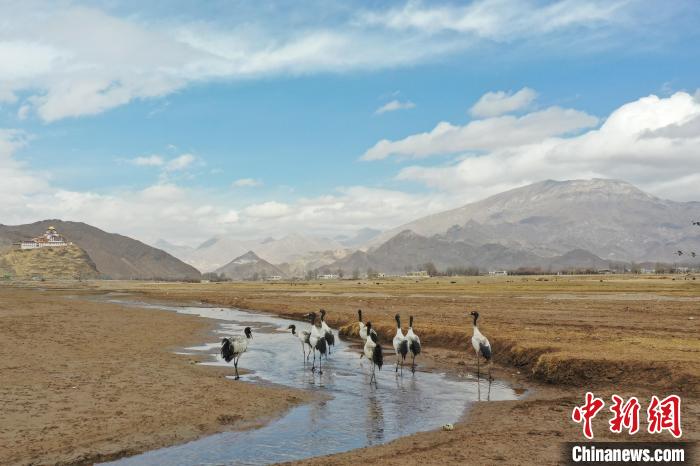 圖為黑頸鶴在林周縣境內(nèi)的農(nóng)田里覓食、嬉戲。貢嘎來松 攝