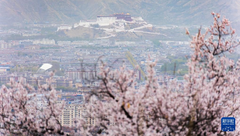 ??在位于拉薩北部的古剎帕邦喀附近拍攝的盛開的桃花,遠處是布達拉宮(4月9日攝)。新華社記者 丁增尼達 攝
