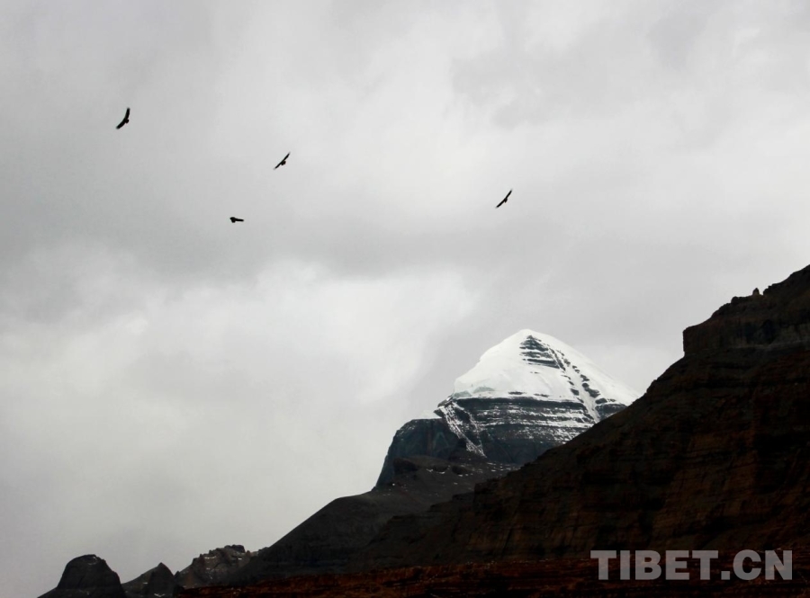 圖為位于西藏自治區(qū)阿里地區(qū)普蘭縣巴嘎鄉(xiāng)的岡仁波齊上空群鷹翱翔 攝影:劉莉