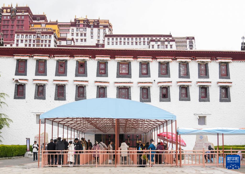 5月5日,游客在布達(dá)拉宮景區(qū)入口排隊(duì)等候參觀。新華社記者 丁汀 攝