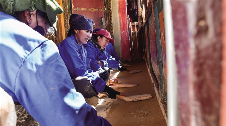 5名藏族女工一邊唱著歌,一邊用手中的工具“帛多”夯打著腳下的碎石和泥土,木棒夯土的聲音是節(jié)奏,歌聲與步調(diào)統(tǒng)一,她們一輪又一輪地合唱著。在不間斷地敲打地面數(shù)小時(shí)后,石子狀的“阿嘎”被打成平地。達(dá)桑告訴記者,這是泥匠組在通過(guò)“打阿嘎”對(duì)布宮地面有裂縫的地方進(jìn)行修補(bǔ)。