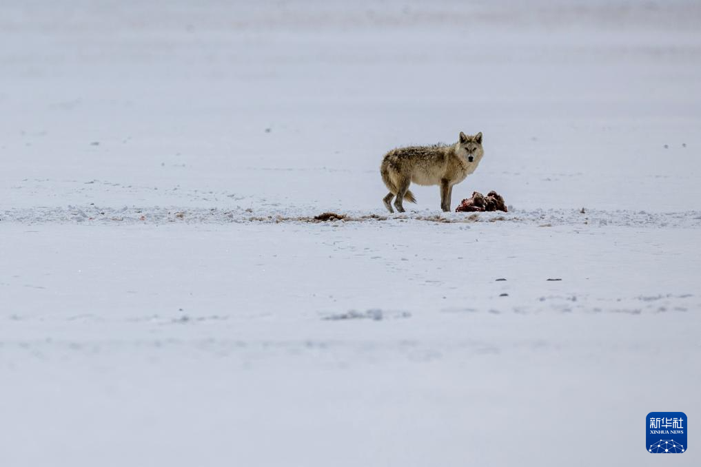 在西藏那曲市尼瑪縣境內(nèi)的羌塘國家級(jí)自然保護(hù)區(qū)核心區(qū),一只狼在進(jìn)食(5月9日攝)。新華社記者 姜帆 攝 ??