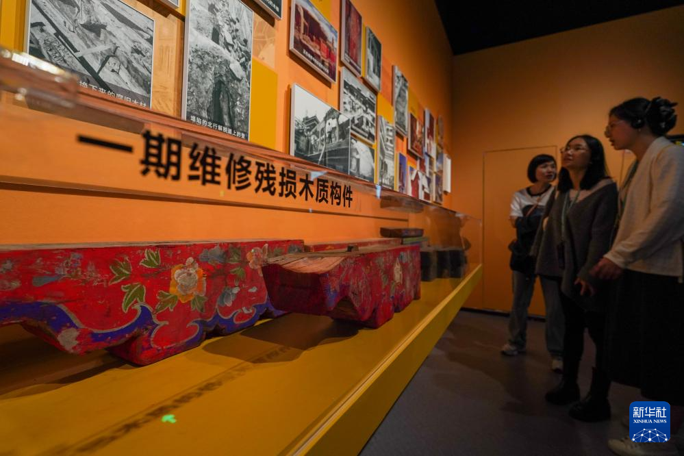 5月11日,觀眾在展出現場參觀布達拉宮一期維修殘損木質構件。新華社記者 李博 攝