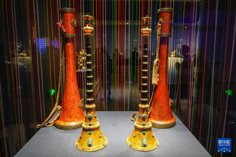 5月11日,“布達拉宮——來自雪域的世界文化遺產”展覽現場展出的“藏式嗩吶”。新華社記者 李博 攝