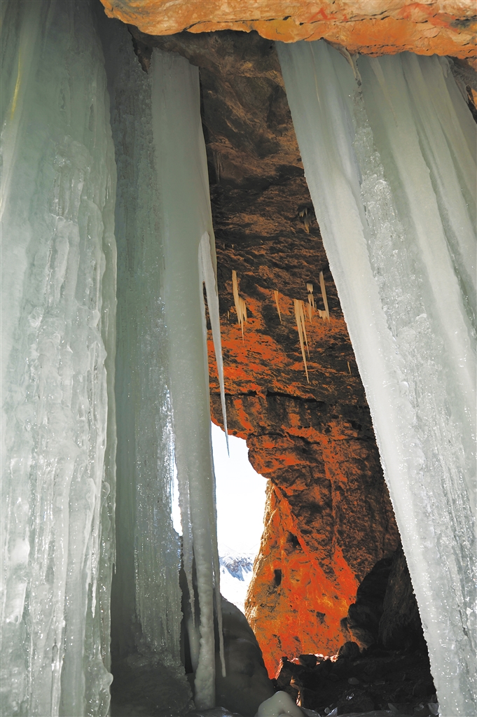 門莫溶洞在山頂,海拔4974米,有著世界上最高溶洞的美譽(yù)。望之可及,登則不易,最后幾百米碎石路尤險(xiǎn)。溶洞呈豎井式,洞底深幽,直達(dá)地心深處;洞口開闊,一條條冰簾垂天際,透過(guò)山頂洞口遠(yuǎn)觀地球之巔,仿佛我們這些“山頂洞人”透過(guò)這門莫之眼,也可參天地悟古今,瞬間將剛才登山的肺腑翻騰忘卻于腦后。