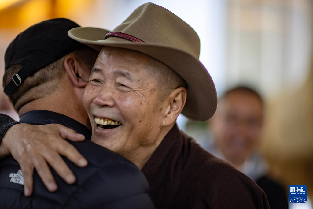 5月18日,吳雨初在西藏牦牛博物館與友人擁抱。新華社記者 姜帆 攝 ??