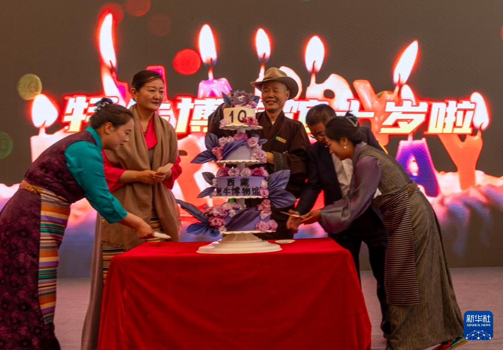 5月18日,吳雨初(左三)為西藏牦牛博物館切生日蛋糕。新華社記者 姜帆 攝