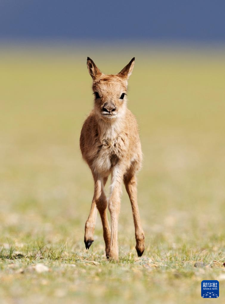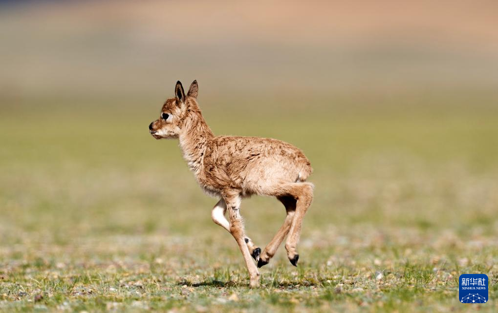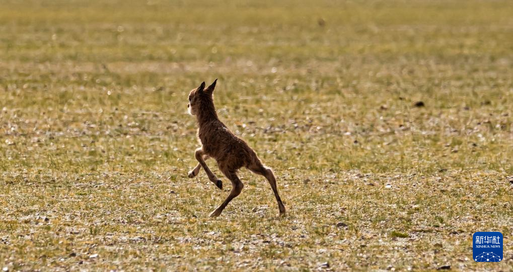 6月17日,在魯確塘草原,一只剛出生不久的小藏羚羊在草地上奔跑。新華社記者 費茂華 攝??
