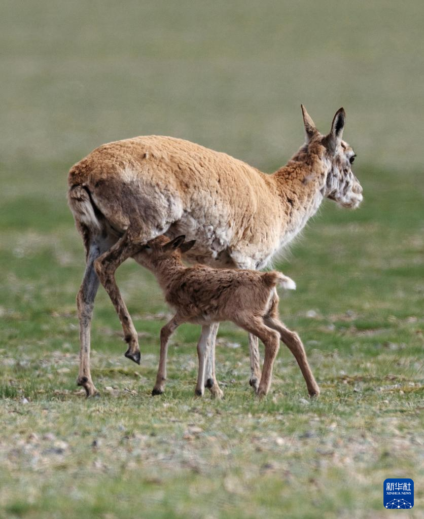 魯確塘草原上,小藏羚羊在吃奶(6月17日攝)。新華社記者 普布次仁 攝