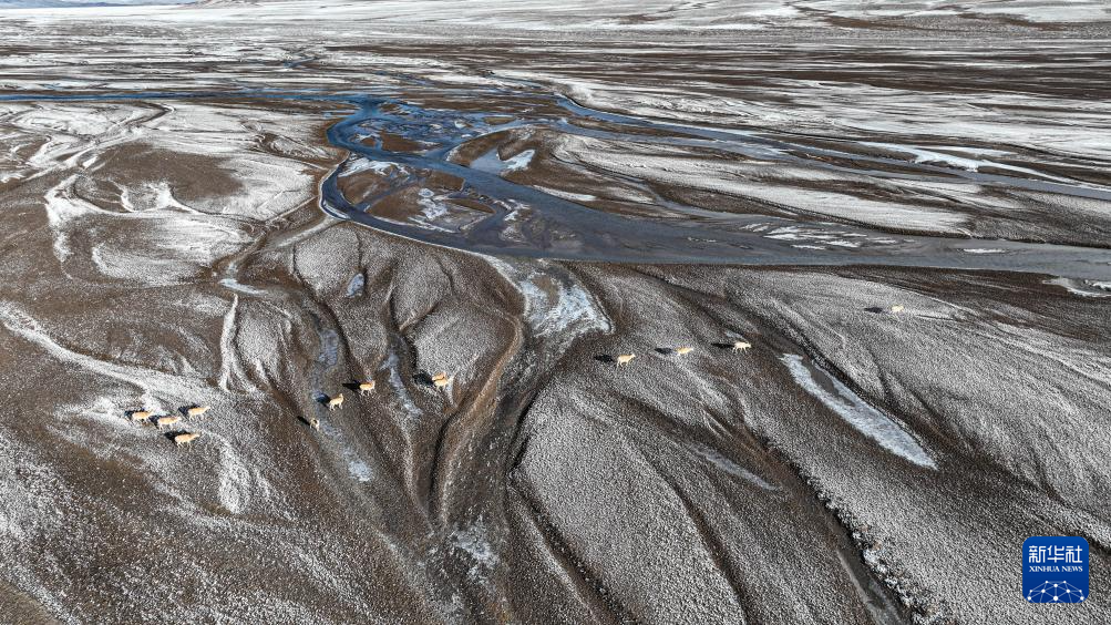 藏羚羊排隊走過甜水河河床,留下整齊的印跡(6月15日攝,無人機照片)。新華社記者 晉美多吉 攝