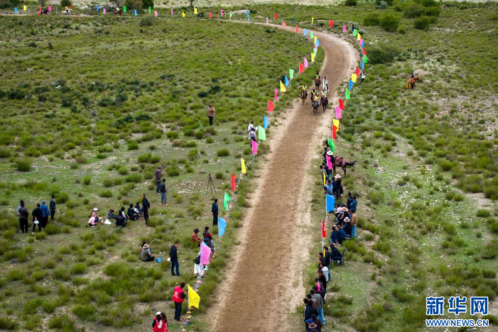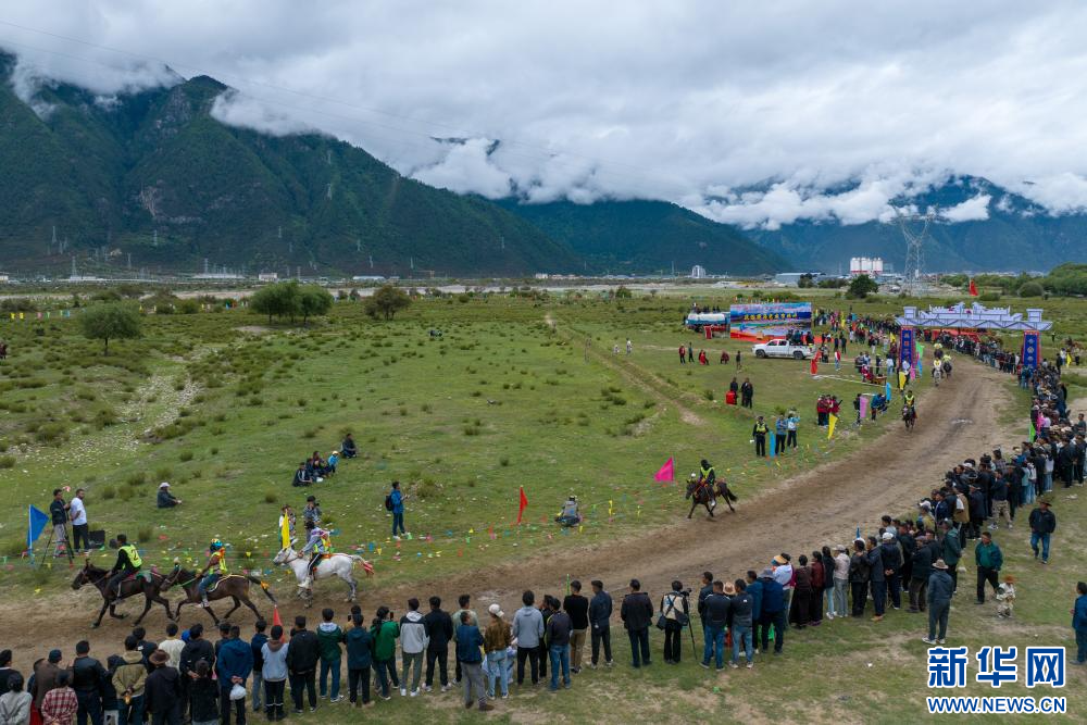 西藏林芝市林芝鎮(zhèn)第七屆尼洋旅游文化之民俗賽馬藝術(shù)節(jié)活動現(xiàn)場(7月22日攝,無人機照片)。新華網(wǎng)發(fā) 王周旭 攝
