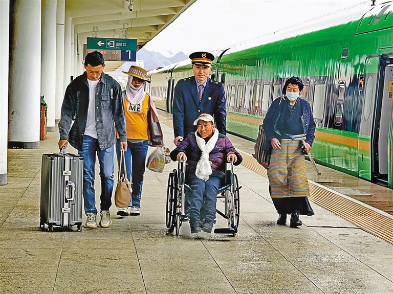 日喀則站“黨員突擊隊”和青年志愿者熱心服務(wù)重點旅客。