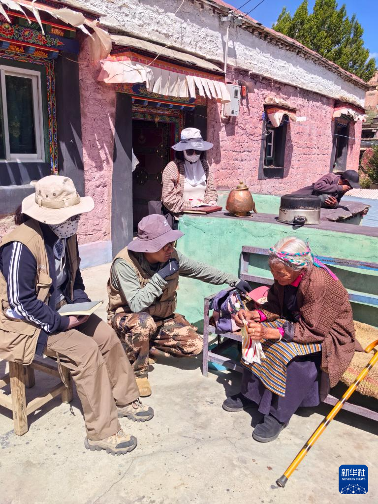 普查隊(duì)員在山南市曲松縣曲松鎮(zhèn)瓊嘎村向當(dāng)?shù)乩先俗稍冊(cè)摯鍤v史文化情況。(受訪者供圖)