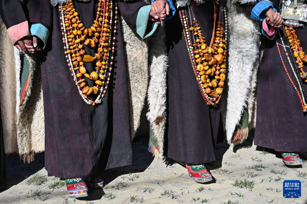 9月9日,在西藏阿里地區(qū)普蘭縣科迦村,村民身著普蘭服飾表演宣舞。新華社記者 孫瑞博 攝 ??