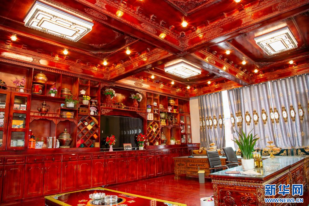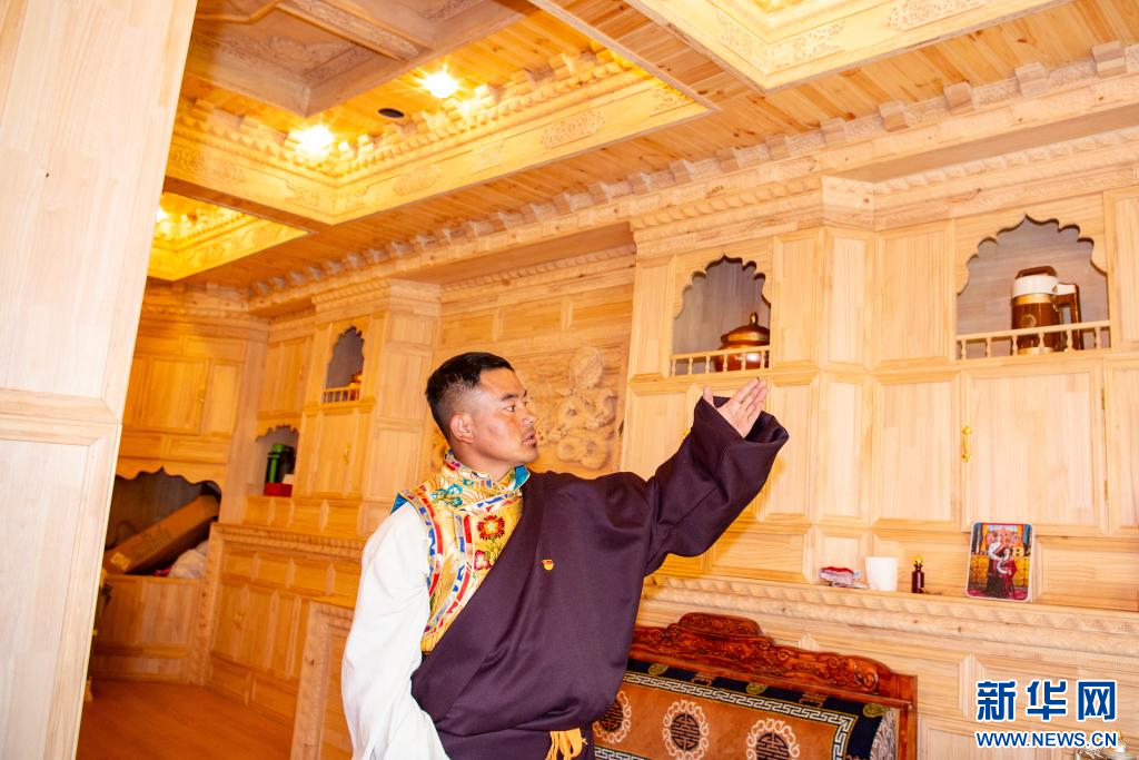 10月14日,昌都市左貢縣旺達(dá)鎮(zhèn)兵達(dá)村村民貢布普措在介紹自家裝飾。新華網(wǎng) 旦增努布 攝