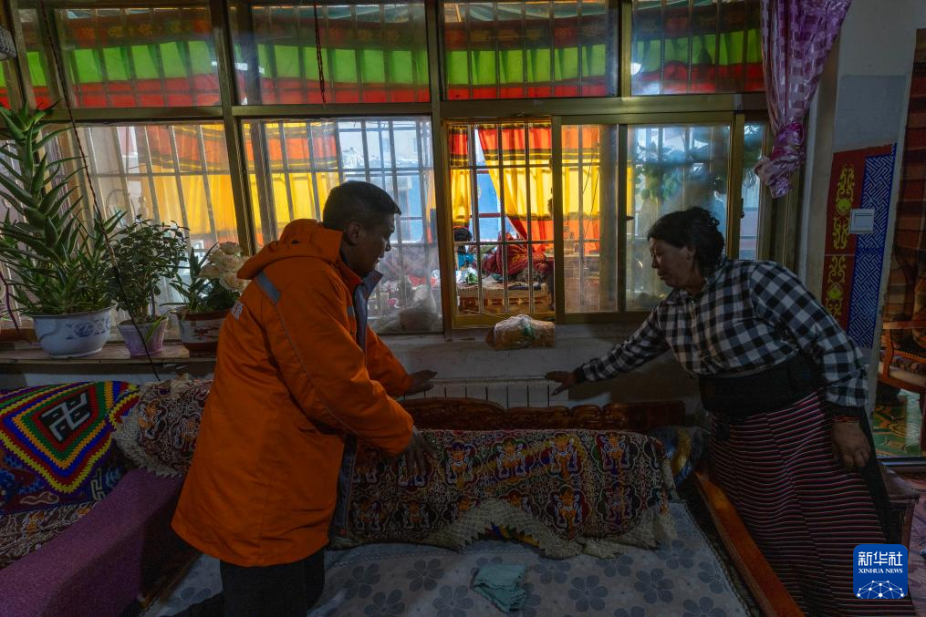 措勤縣城區(qū)清潔能源集中供暖特許經(jīng)營(yíng)項(xiàng)目工作人員次旺羅布(左)在扎日南木錯(cuò)社區(qū)居民曲珍家查看供暖情況(11月20日攝)。新華社記者 姜帆 攝 ??