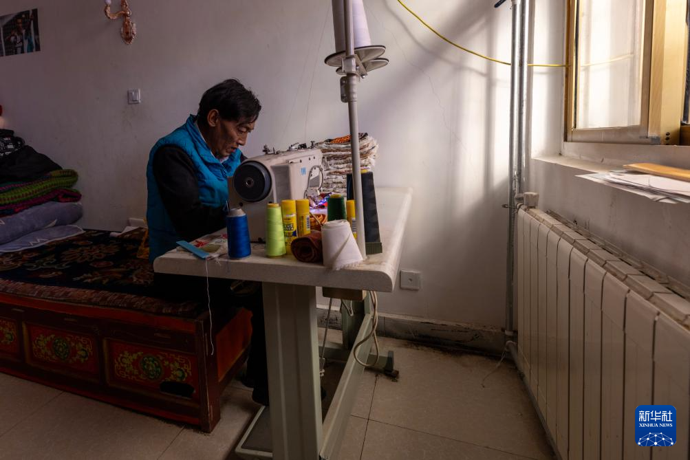 措勤縣扎日南木錯(cuò)社區(qū)居民林瓊在自家的暖氣房?jī)?nèi)制作傳統(tǒng)民族帽飾(11月20日攝)。新華社記者 姜帆 攝 ??