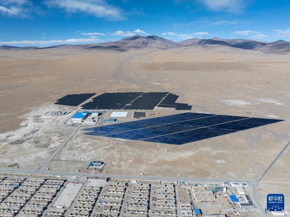 鳥瞰措勤縣城區(qū)清潔能源集中供暖特許經(jīng)營(yíng)項(xiàng)目的光伏陣列(無人機(jī)照片,11月20日攝)。新華社記者 姜帆 攝 ??