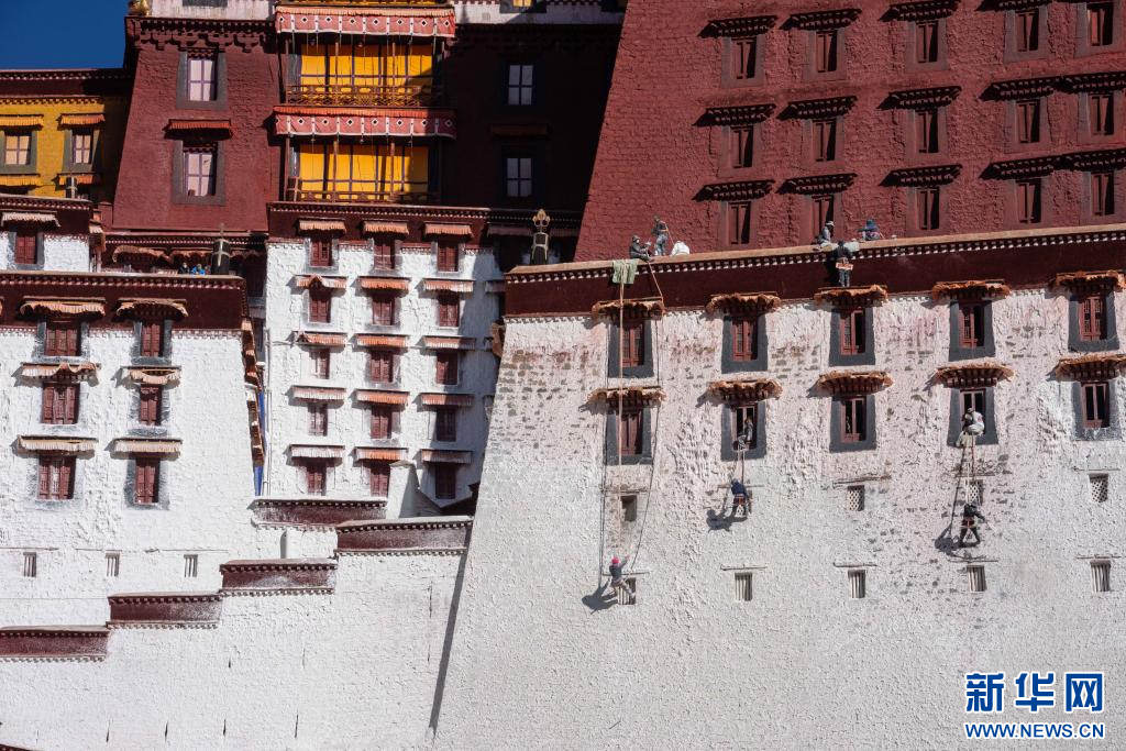 10月30日,布達拉宮管理處工作人員開展例行“潑甜墻”,對外墻進行粉刷。新華社記者旦增尼瑪曲珠 攝