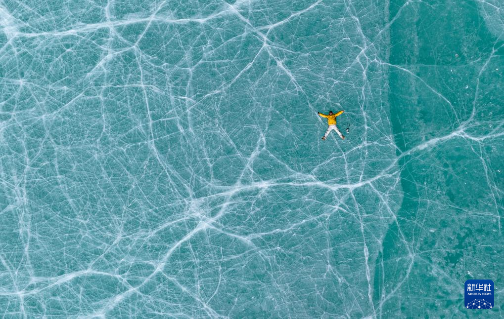 12月7日,一名游客躺在瓊穆崗嘎峰前的冰湖上拍照(無人機(jī)照片)。新華社記者 丁增尼達(dá) 攝 ??
