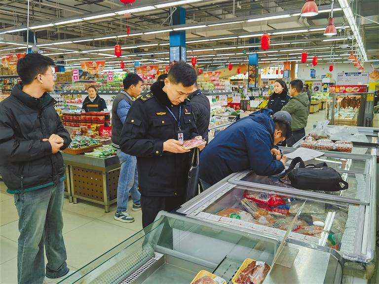 圖為執(zhí)法人員在商超開展肉制品檢查。記者 央金 攝
