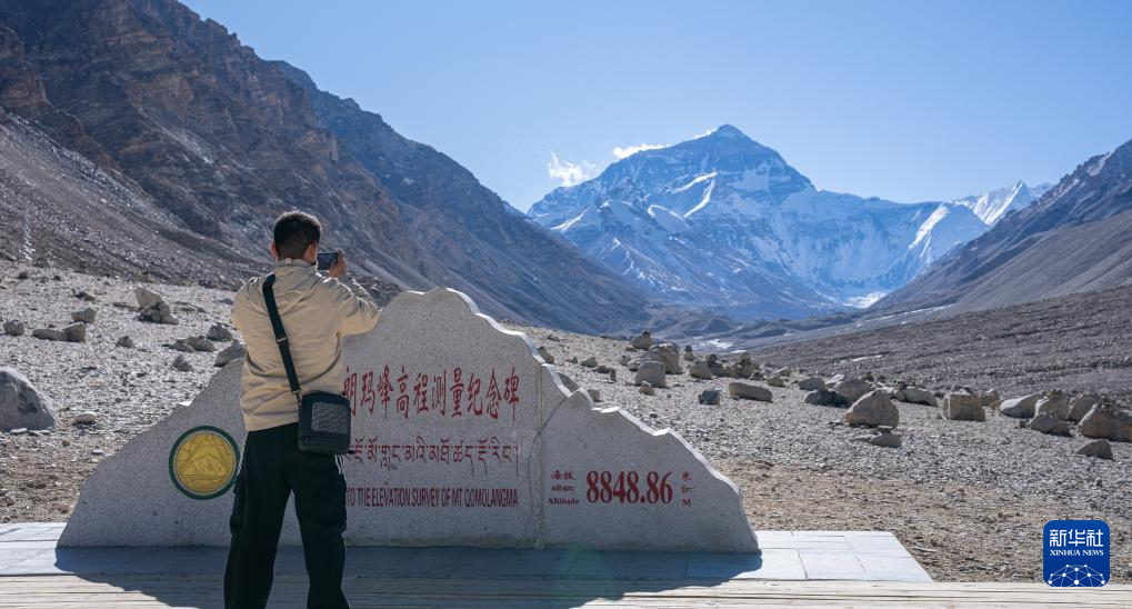 12月14日,游客在珠穆朗瑪峰高程測量紀(jì)念碑前拍照留念。新華社記者 丁增尼達(dá) 攝 ??