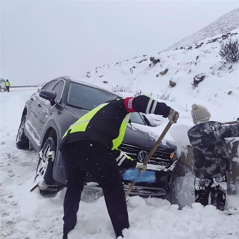 民警雪天救援被困車(chē)輛。 圖由自治區(qū)公安廳交管局提供