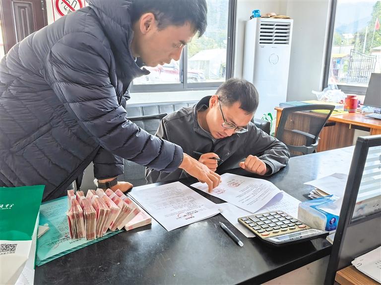 墨脫縣新創(chuàng)農(nóng)業(yè)科技開(kāi)發(fā)公司工作人員為波東村種植戶結(jié)算靈芝款。