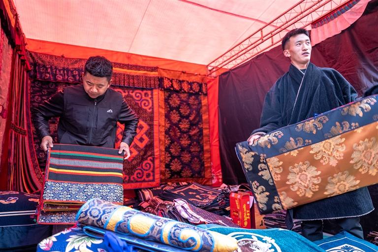 據(jù)悉,此次堆龍德慶區(qū)的年貨節(jié)以“逛展位、享樂購、觀演藝、送政策、寫祝?!睘槲宕蠛诵牧咙c。參展商戶共有118戶,其中既有堆龍本土企業(yè)和合作社帶來的藏歷新年年貨、農(nóng)畜加工產(chǎn)品、民族手工藝品、傳統(tǒng)服飾,也有山南錯那市相關企業(yè)帶來的特色產(chǎn)品,品類總數(shù)達百余種。開幕當日人流量達1000余人,銷售額10萬余元,呈現(xiàn)出購銷兩旺的熱鬧景象。攤主土旦羅布介紹:“這次我?guī)砹瞬貧v新年禮盒套裝,里面不僅包含了藏文對聯(lián)和吉祥八寶紅包,還有‘古突’里可包裹的12種代表不同寓意的簽文及寓意,很有過年的儀式感,非常受市民歡迎?!?/p>