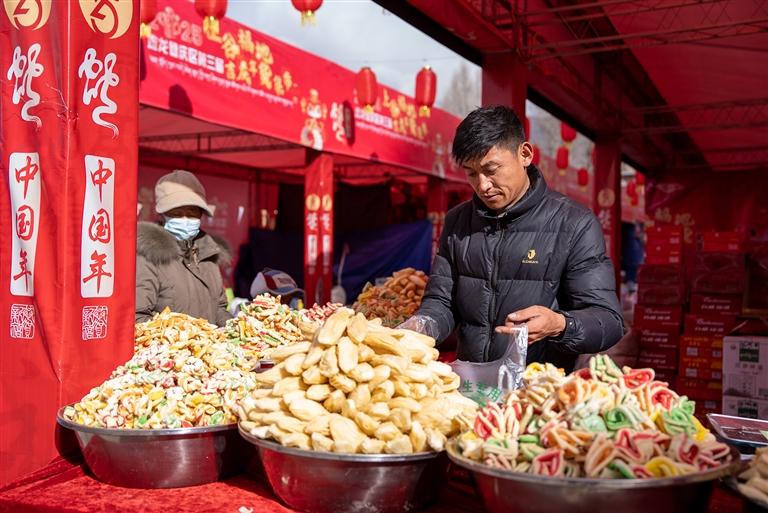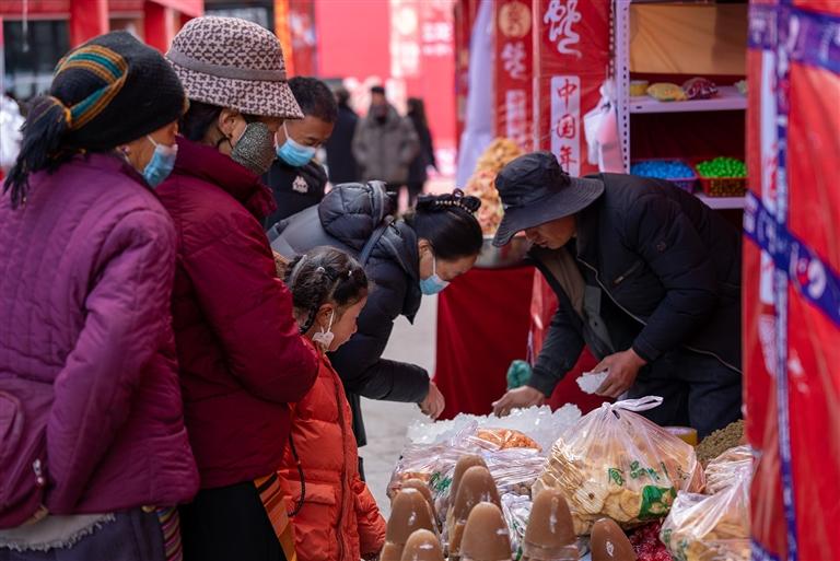 活動當天,記者來到位于拉薩市城關區(qū)蔡公堂街道恩惠苑社區(qū)翰林苑小區(qū)附近的年貨市場,只見現(xiàn)場人聲鼎沸。150個攤位整齊排列,各類年貨商品琳瑯滿目,讓人目不暇接。這里有糖果、堅果、酥油、卡塞等傳統(tǒng)食品,有豬肉、牛肉干、羊肉等肉類制品,還有臘味熟食、奶渣餅等特色小吃,以及藏文對聯(lián)、喜慶裝飾、廚具餐具等日用百貨,完全能滿足居民群眾一站式的年貨購物需求。